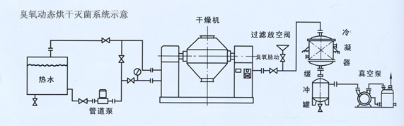 將物料裝入雙錐體轉筒內,抽真空達到-0.6~0.8Mpa時向料筒內加入臭氧氣體,料筒不停的反轉使物料與臭氧氣體充分的接觸進行滅菌,滅菌完成後加熱幹燥。通過錐體的夾層將熱量傳遞給物料,不停轉動的錐體利用重力的作用使物料充分與錐體內壁接觸,真空係統配合不斷的抽出濕氣,從而達到滅菌幹燥的目的。